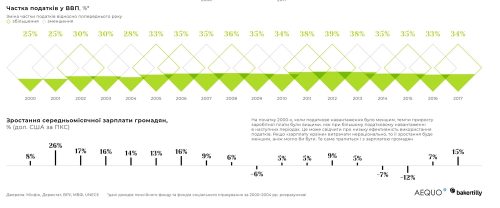 Этот график показывает, как рост налогов в ВВП повлияло на зарплату украинцев. Четко видно, что в период с меньшей налоговой нагрузкой на экономику или с возрастающей нагрузкой (то больше, то меньше) рост зарплаты бы большим, чем при стабильно высокой нагрузке.
