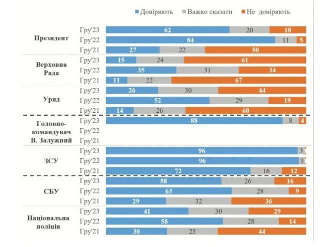 Доверие граждан Украины к президенту Владимиру Зеленскому снизилось с 84% в декабре 2022 года, до 62% в декабре 2023, а доверие к ВСУ и главнокомандующему Валерию Залужному составляет соответственно 96% и 88%. В то же время 59% граждан одновременно доверяют и Зеленскому, и Залужному.