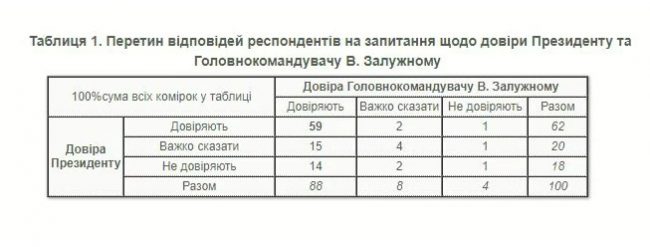 Таким образом, по данным таблицы, большинство украинцев, или 59% — одновременно доверяют и президенту, и главнокомандующему. Доля украинцев, которые имеют поляризованные взгляды, является достаточно небольшой. Так, только 14% доверяют главнокомандующему и при этом не доверяют президенту, и только 1% доверяют президенту, но не доверяют главнокомандующему.