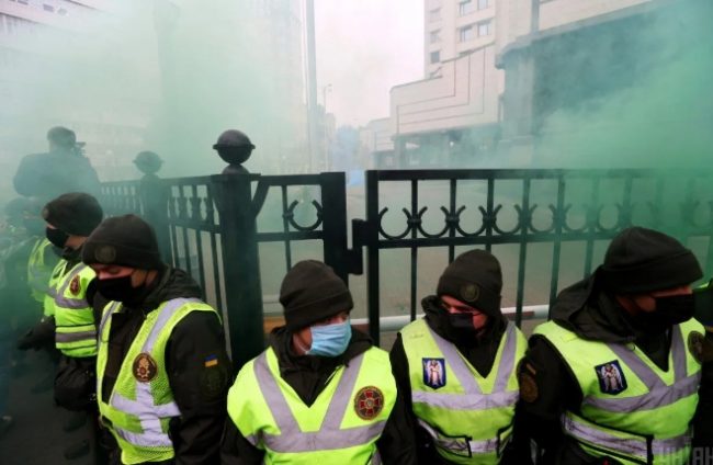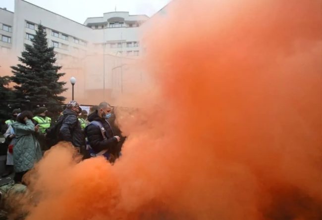 Протестующие у здания КСУ зажгли фаеры и забросали двор суда дымовыми шашками, а также петардами и презервативами. Полиция усиливает свои ряды.