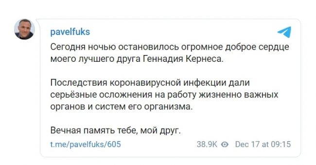 Олигарх Павел Фукс на странице в Telegram также написал о смерти своего друга.
