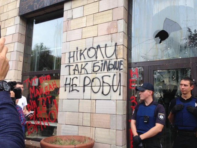 Активисты патриотических организаций, в том числе «Национального корпуса» и «С-14», разбили окна в магазине, забросали его яйцами, подожгли у его входа шины. На стенах написали «Здесь был Майдан, и он здесь будет вечно!», «Уважение к истории», «Не сотрешь нас».