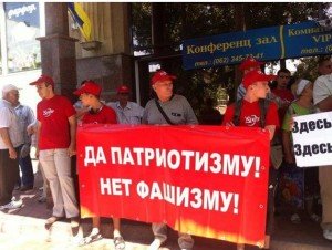 Вход в гостиницу "Ева", где должна была состояться презентация книги народного депутата от ВО "Свобода" Ирины Фарион, заблокировали. Около 20 человек с атрибутикой КПУ и красными транспарантами выстроили непроходную стену. Также митингующие заблокировали доступ к отелю со стороны переулка Орешкова. Ирина Фарион прошла в здание с запасного входа.