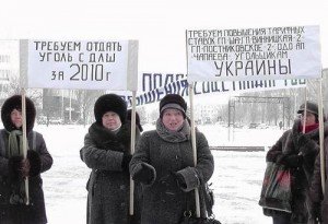 Нет подорожанию без повышения соцстандартов!, Требуем отдать бытовой уголь за 2010 год!, Требуем повышения тарифных ставок для наших мужей!, Требуем убрать копанки, они разъедают наш Донбасс! и другие.