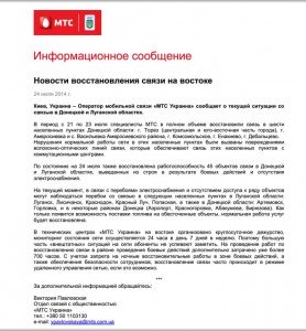 На текущий момент, в связи с перебоями электроснабжения и отсутствием доступа к ряду объектов могут наблюдаться перебои со связью в следующих населенных пунктах в Луганской области: Луганск, Лисичанск, Краснодон, Красный Луч, Попасная, а также в Донецкой области: Артемовск, Горловка, и в некоторые районах Донецка (Аэропорт, Красногоровка, Абакумова, Бирюзова). Как только появится возможность поставки топлива на обесточенные объекты, нормальная работа услуг будет восстановлена».