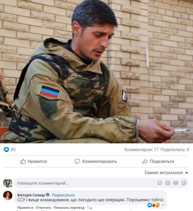 «ССУ и высшее командование, согласовало эту операцию. Порошенко то-есть (ССУ — Сюмар, очевидно имела в виду Силы специальных операций ВС Украины, — ред.)», – написала Сюмар.