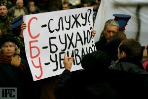 Люди с плакатами осуждают сотрудника СБУ и требуют справедливого расследования обстоятельств дорожно-транспортного происшествия.