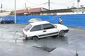 Возле Конного рынка в Харькове автомобиль «Жигули» провалился под асфальт, выезжая с парковки. В заложниках асфальта оказалось заднее колесо.