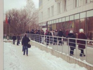 Предварительно забрав пропуска, работников фирмы выпускают из помещения по десять человек, вовнутрь никого не пускают.