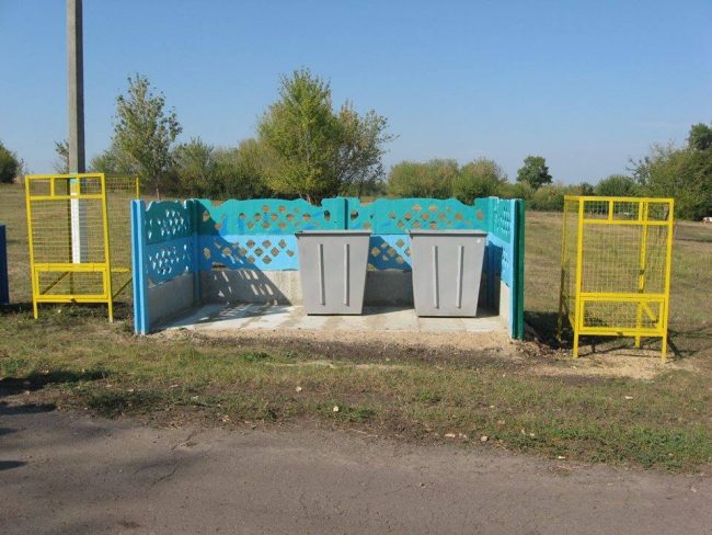Под стать фантастическим остановкам и площадка для раздельного сбора твердых бытовых отходов или по простому – «мусорка». Естественно, в цветах государственного флага.
