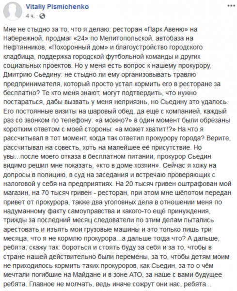 В Каховке владелец ресторана “Парк Авеню” Виталий Писмиченко сообщил в Фейсбуке, что местный прокурор Дмитрий Сьедин мстит ему за отказ бесплатно кормить в своем заведении.