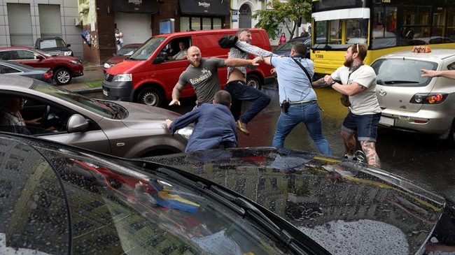 Один из участников инцидента вел себя неадекватно и прыгнул на капот автомобиля экс-президента и подпрыгнул на нем. После этого в дело вступила охрана и завязалась драка.