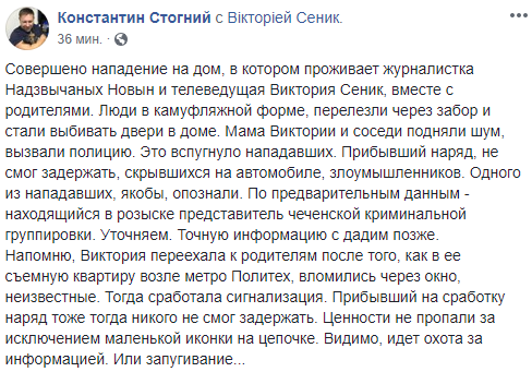 В Киеве неизвестные напали на дом, в котором вместе с родителями живет журналистка проекта «Надзвичайнi Новини» и телеведущая Виктория Сеник. Об этом в Facebook сообщил журналист Константин Стогний. Он написал: «Люди в камуфляжной форме, перелезли через забор и стали выбивать двери в доме. Мама Виктории и соседи подняли шум, вызвали полицию. Это вспугнуло нападавших. Прибывший наряд, не смог задержать, скрывшихся на автомобиле, злоумышленников. Одного из нападавших, якобы, опознали. По предварительным данным — находящийся в розыске представитель чеченской криминальной группировки. Уточняем. Точную информацию с дадим позже».
