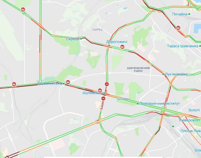 Из-за ремонта на Шулявке образовались заторы на ул. Академика Палладина, Большой Кольцевой дороге, ул. Николая Василенко, просп. Леся Курбаса, Соборной, Воздухофлотском проспекте, ул. Валерия Лобановского, ул. Вячеслава Чорновила, сообщает Левый берег.