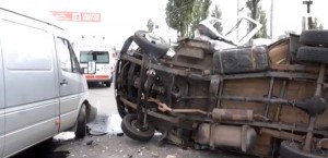 В Киеве на улице Фрунзе около трамвайного депо «Киевпасстранса» перевернулась маршрутка с пассажирами. На место ДТП выехали несколько карет скорой помощи, все кто оказался по близости бросились помогать пострадавшим.