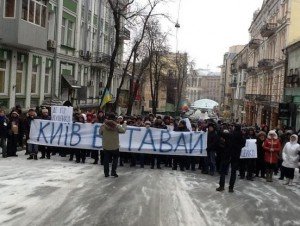 На акции скандируют: "Киев вставай! Своих визволяй!", "Один за всех и все за одного!", "Брат за брата против палача!", "Где он?" и др.