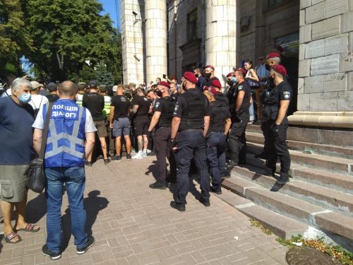 В то же время, под здание Нацсовета пришли представители Нацкорпуса и С14, которые попытались сорвать акцию. Радикалы начали толкать и кричать на журналистов и тех, кто пришёл поддержать акцию. Однако в дело вмешалась полиция и оградила участников от нападавших националистов. Их лидер Евгений Карась кричал, что на акции собрались все сепары.
