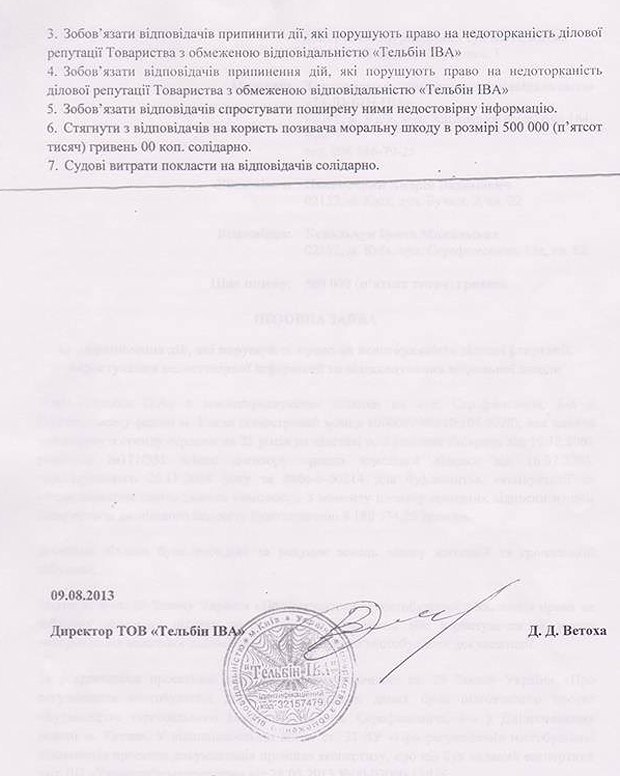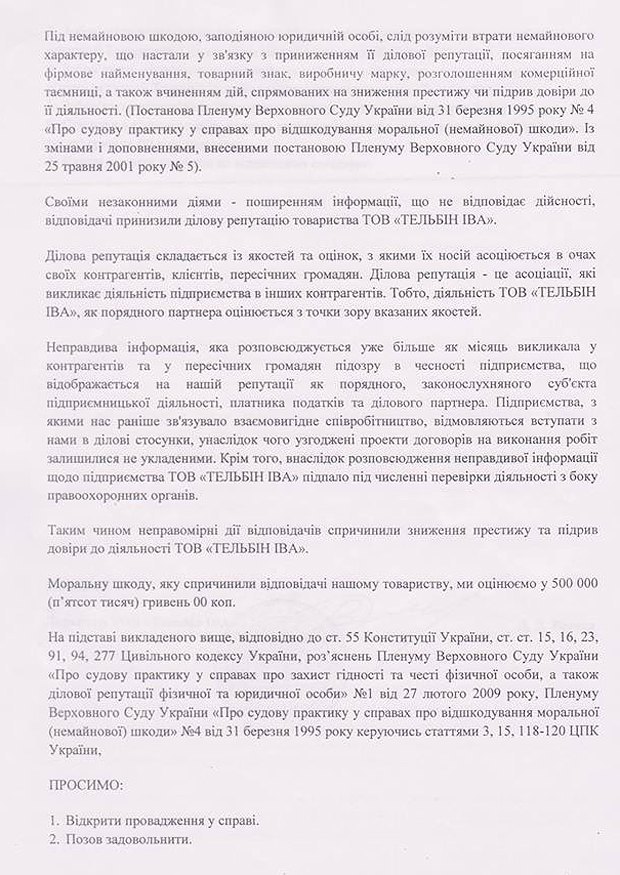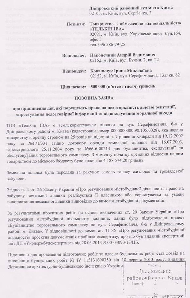Кроме того, как стало известно LB.ua, застройщик «Тельбин ИВА» подал в суд на двух других активистов, защищающих сквер на Серафимовича. Так, активистам Андрею Наконечному и Ирине Ковальчук был предъявлен иск на 500 тыс. грн за моральный ущерб, который они якобы нанесли тем, что «вызвали у граждан подозрение в нечестности компании».