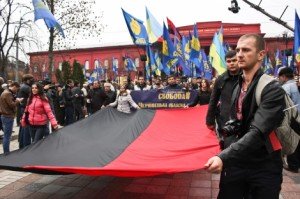 Присутствующие держат национальные флаги, красно-черные флаги УПА и партийную символику.