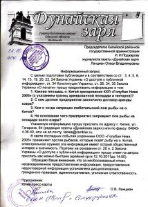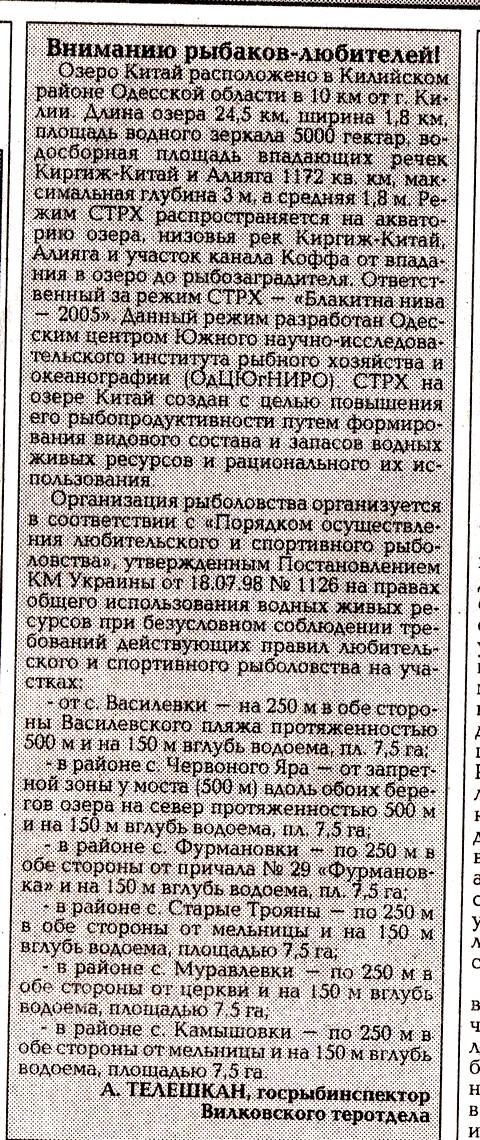 Автор статьи направила информзапрос председателю Килийской районной государственной администрации Ивану Ивановичу Поджарову с вопросом: «На каком основании охранники предприятия «Голубая Нива 2005» запрещают на оз. Китай лов рыбы населению?». Ответ был таков: «данный вопрос регулируется Режимом рыбохозяйственной эксплуатации специального товарного рыбного хозяйства (СТРГ) оз. Китай (2008-2017 р.р.), который согласован Главным государственным управлением охраны, использования, воссоздания, ВЖР и регулирование рыболовства в Одесской области и утвержден управлением охраны окружающей естественной среды в Одесской области в 2007 году».