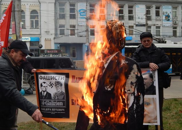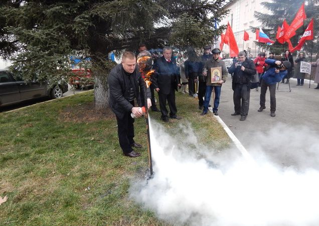 Сегодня в Симферополе пророссийские организации Крыма провели акцию протеста против маршей «Свободы». Ее участники, порядка 30-40 человек, собрались у здания Постоянного представительства Президента в АРК, где сожгли флаг ОУН-УПА и чучело Степана Бандеры. Также митингующие потребовали от Виктора Януковича запретить партию "Свобода" и все «неонацистские движения на Украине», а также принять закон о запрете всех радикальных организаций неонацистского и экстремистского толка.