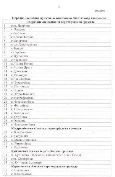 Согласно распоряжению, которое подписал начальник Купянской МВА Андрей Конашевич, обязательную эвакуацию из Купянской общины в безопасные регионы Украины объявили для Купянска, Заоскалья, Ковшаровки и Купянска-Узлового. Также в районе обязательная эвакуация касается жителей Дворичанской, Петропавловской, частично Кондрашевской и Куриловской общин.