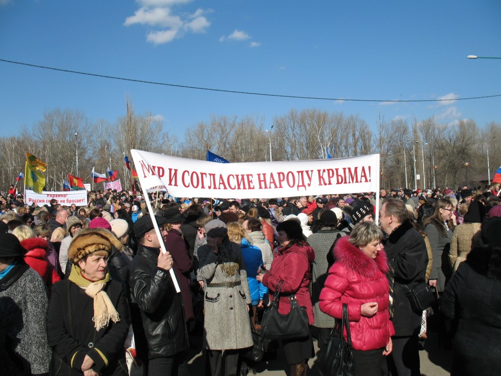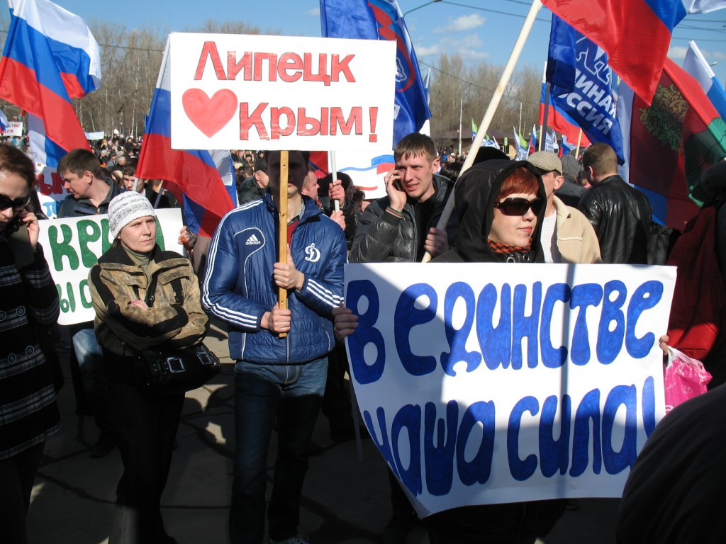 Сегодня, 14 марта, в городе Липецк Российской Федерации на площади Петра прошел митинг в поддержку Крыма. Собралось более десяти тысяч человек, практически половина из них держала в руках плакаты с надписями: Липецк любит Крым, Две страны один народ, Россия своих не бросает, Мир и согласие народу Крыма, В единстве наша сила, Нам не безразлична судьба Крыма и так далее.