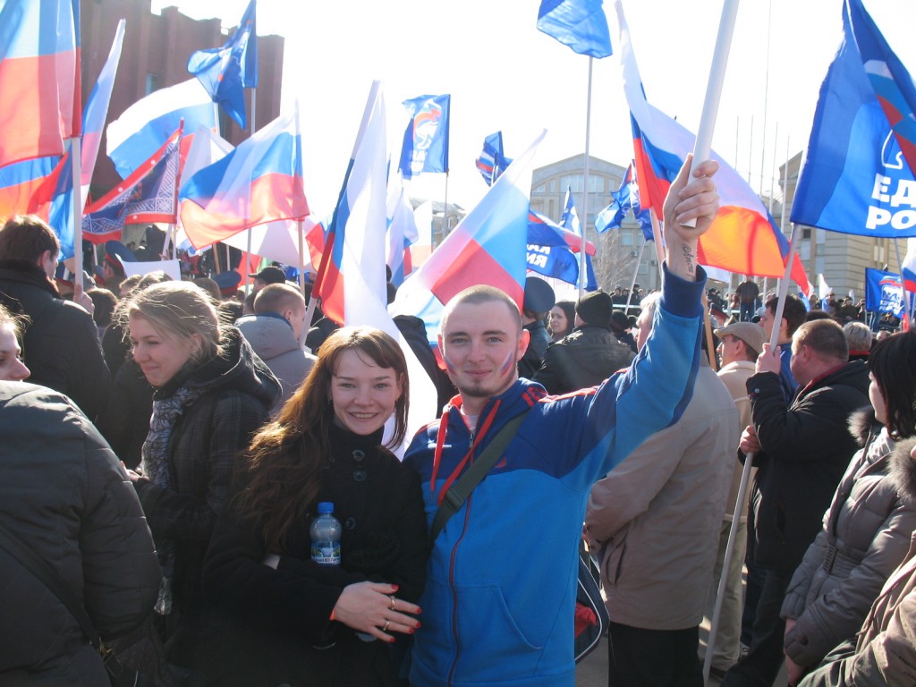 Акция в поддержку Крыма в Липецке длилась около получаса, после ее окончания на сцену вышла молодежь в черных футболках с надписью – Слава Беркуту и с флагами России в руках.
