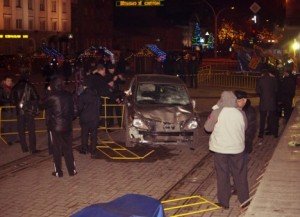 На центральной площади Луганска поздно вечером 13 января автомобиль на большой скорости врезался в толпу празднующих Старый Новый год.