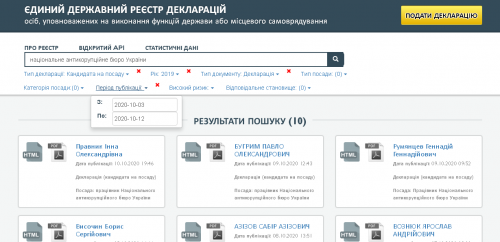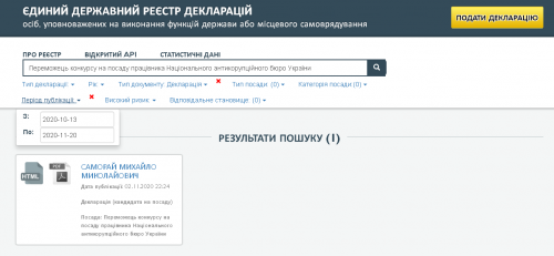 Определить победителя на вакантную должность возможно также через сайт Назка, через указания в поиске «Победитель конкурса на должность работника Национального антикоррупционного бюро Украины». Так, за период с 13 октября текущего года, с такой пометкой на сайте Назка есть только одна Декларация: