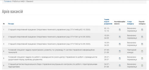 Так, в период с 3 по 10 октября 2020 было открыто конкурс на старшего оперативного работника Оперативно-технического управления НАБУ (код должности ОТУ / 1448-р / 02.10.2020).