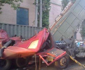 "Удар был настолько сильным, что кабина самосвала превратилась в груду металла. От машины оторвало прицеп, а пара задних колес отлетела на полметра от грузовика. Если водитель выжил, то он родился в рубашке", - рассказали свидетели ДТП.