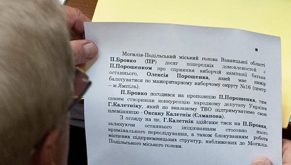 Как видно на фотографии, которую сделал корреспондент Цензор.НЕТ, речь идет о конфликте, который возник на одном из мажоритарных округов Винницкой области. На один округ, как понятно из записки, претендуют родственники сразу двух высокопоставленных представителей власти: отец главы Минэкономики Петра Порошенко* - Алексей Порошенко, и племянница нардепа-регионала Григория Калетника* - Оксана Калетник (Елманова). Отметим, что Григорий Калетник является отцом главы Таможенной службы Игоря Калетника, который назначен на эту должность по квоте КПУ. Причем, мэр Могилев-Подольска, регионал Бровко пообещал поддержку Порошенко, а теперь жалуется на давление Калетника, который обещает "инициировать криминальное преследование".