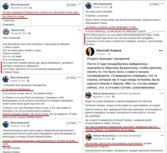 Помимо этого, он признался, что на протяжении десяти лет голосовал за Партию регионов. Беглого президента Виктора Януковича блогер называл законно избранным и заявлял, что при нем украинцам жилось лучше. Особое внимание Бужанский уделял также советской тематике.