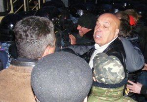 Когда народный депутат Геннадий Москаль попробовал пройти в автобус, сотрудники Беркута его не пропустили. Однако активисты, которые требуют вернуть победу на выборах Корнацкому, смогли разорвать кольцо оцепления и завели Москаля в автобус.