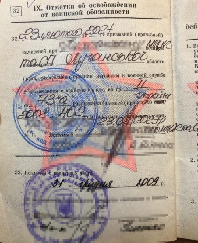 В документе сообщалось, что комиссия городского территориального центра комплектования и социальной поддержки в Луганской области признала мужчину негодным к военной службе по ст. 73 приказа Министерства обороны Украины № 402 от 14.08.2008 года «Беременность, роды и послеродовой период, их последствия» с пометкой «а» — с осложненным течением.