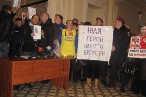 На месте, где обычно проводят брифинг представители защиты и прокурор, оказался правозащитник Александр Каряка. Он пытался сорвать брифинг, а сторонники Тимошенко мешали ему сделать это. Некоторые сторонники Тимошенко были одеты в жилеты с надписями на английском языке: "Patriots Freedom", "Ukraine not to break". Еще несколько держали плакат с надписью "Юля - герой нашего времени".