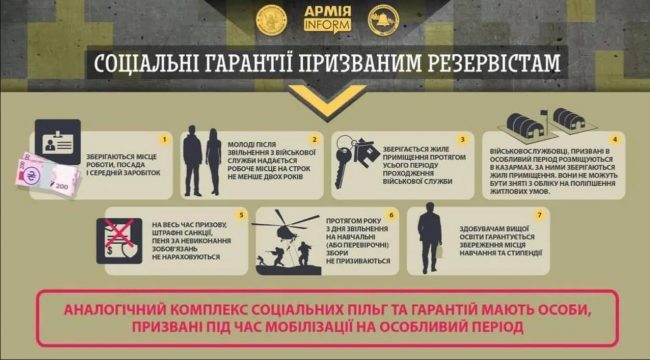 В случае призыва резервистов на них будут распространяться те же трудовые, социально-правовые и образовательные гарантии, предусмотренные для мобилизованных лиц. За резервистами сохраняется место работы и средняя зарплата, а если они безработные, то им государство будет платить минимальную зарплату. Также государство гарантирует содействие в трудоустройстве в течение шести месяцев после прекращения службы.