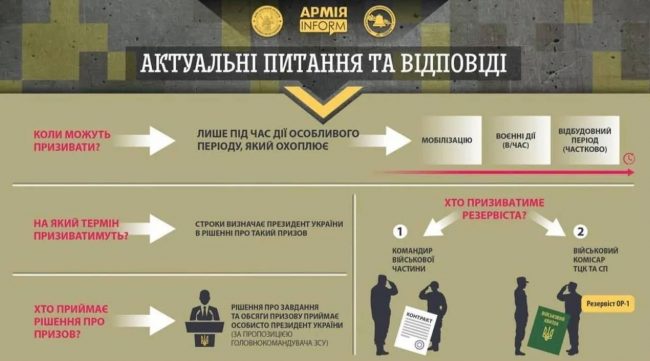 Соответствующий закон предусматривает, что в Украине вводится новый вид службы в армии – «военная служба по призыву лиц из числа резервистов в особый период». Призвать людей из оперативного резерва на службу можно по представлению главнокомандующего армии, сейчас эту должность занимает Руслан Хомчак. А уже в решении Верховного главнокомандующего ВСУ будут определяться задачи, объемы, сроки и порядок проведения призыва. При этом не нужно объявлять всеобщую мобилизацию.