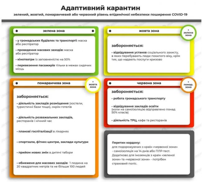 Напомним, что в Украине введен карантин с делением на четыре карантинные зоны: «зеленую», «желтую», «оранжевую» и «красную», которые будут устанавливаться на основании ежедневной оценки признаков, включающих:
