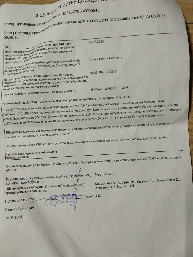 Вечером того же дня в травмпункте Ужгородской городской больницы у нее зафиксировали «ушиб мягких тканей головы, ушиб нижней челюсти». На следующее утро, в понедельник, она с мужем уехала в Ужгородский отдел полиции ГУНП в Закарпатской области.