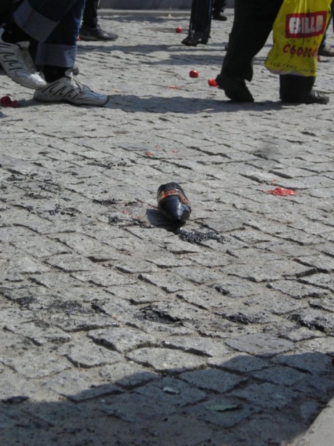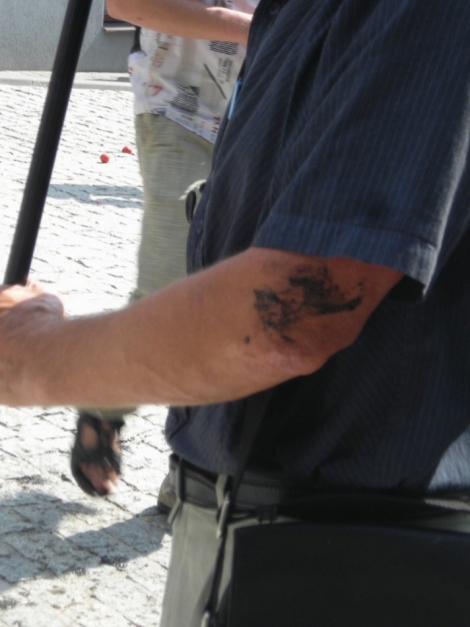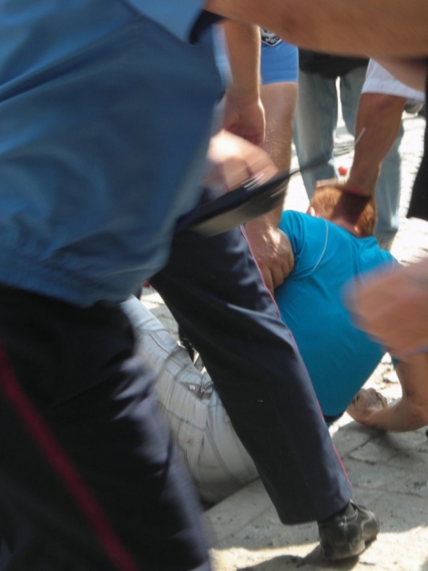 Участники антифашистской акции начали забрасывать националистов помидорами. Вскоре одному из активистов удалось прорваться к г-ну Подлобникову и облить его фекалиями, которые содержались в бутылке. В ответ свободовцы повалили нападавшего на брусчатку и начали избивать.