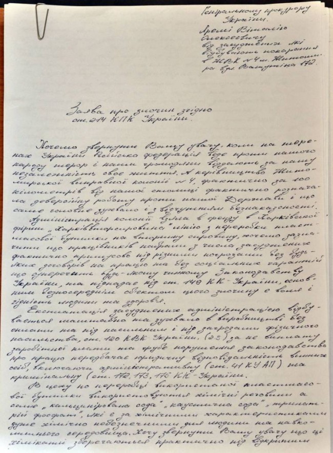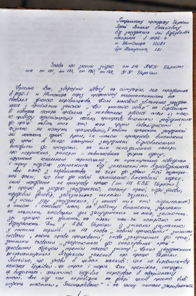 Свои слова и полученную от заключенных информацию Мария дополнила фотографиями десятков документов — это многочисленные заявления от заключенных на имя генпрокурора Украины о перечисленных выше нарушениях, а также документами по учету работы и продукции.