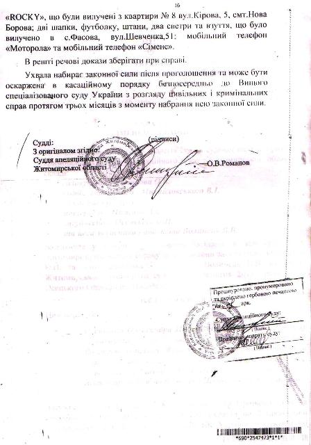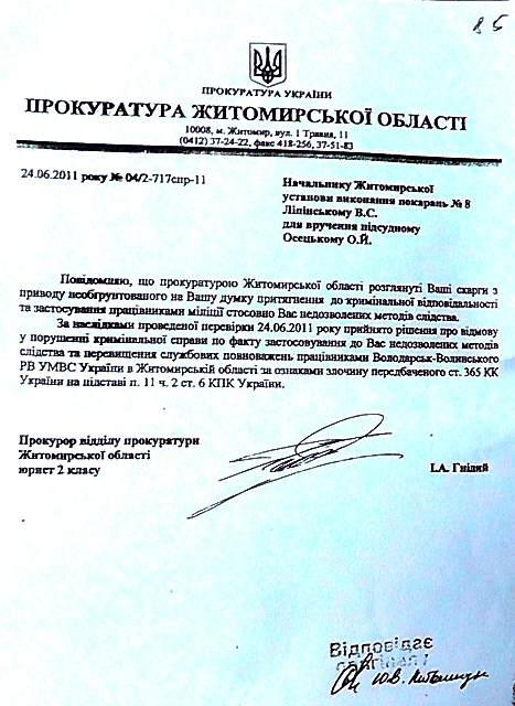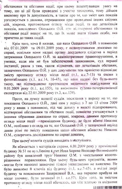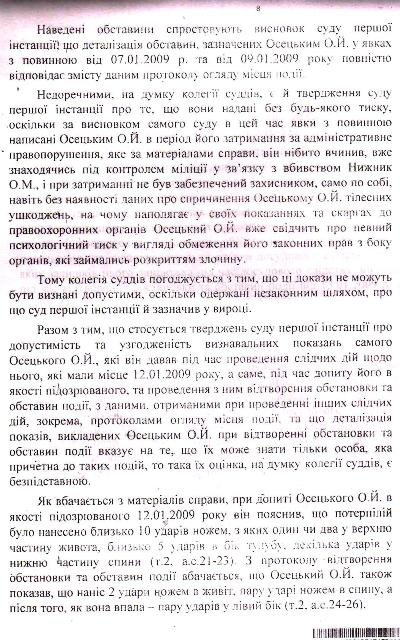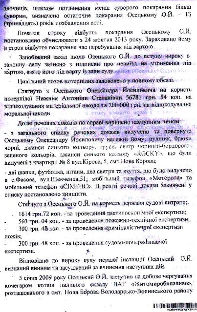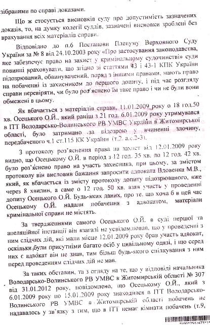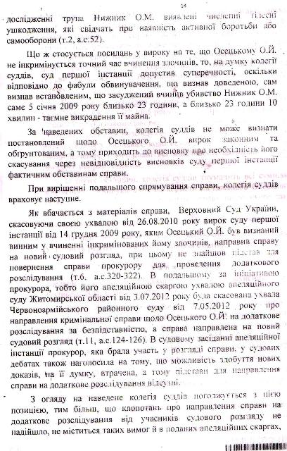 Верховный суд Украины, ознакомившись с этим судебным милицейско — прокурорским белогорячечным бредом, приговор отменил и направил дело на новое рассмотрение, снабдив его чёткими, обязательными к исполнению указаниями относительно выяснения обстоятельств, свидетельствующих о железном алиби Осецкого. Но Житомирский районный суд в составе судей Зубчук, Грубияна и под председательством Станислава Францевича Башинского плевать хотел на эти указания! Судьи отдельным постановлением справедливо признали незаконность действий милиционеров и рекомендовали областному начальству их слегка пожурить, но распоряжение Верховного суда пошло проигнорировали и вдобавок цинично «ликвидировали» алиби Александра Осецкого, грубо сфальсифицировав доказательную базу — время переговоров по мобильной связи указали неверно, сместив его ровно на один час и влепили парню 13 лет тюремного заключения.