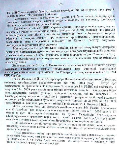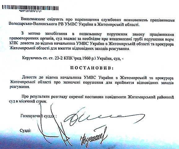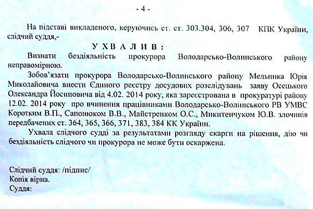 Володарско — Волынский районный суд 2 апреля 2014 года признал незаконной бездеятельность районного прокурора Юрия Мельника и обязал его открыть уголовное производство в отношении оборотней в погонах.