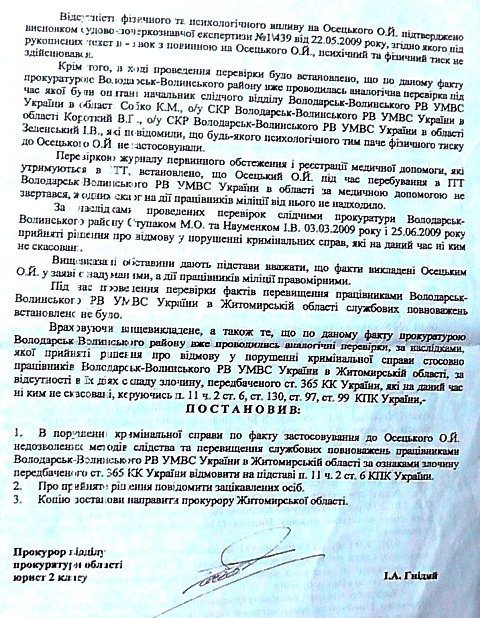 Выгораживая настоящего убийцу, совершил тяжкое должностное преступление и начальник Володарско — Волынского райотдела милиции Михаил Невмержицкий, который официально наврал суду о том, что одного из свидетелей милицейских пыток и издевательств над Осецким якобы вообще в то время не было в райотделе, запамятовав, очевидно «по пьяни», что ранее, опять таки официально, этот факт подтверждал. А ежели не по пьяни, то его самого сажать надо либо в тюрьму, либо с диагнозом «склеротический сволочизм» в лечебницу .