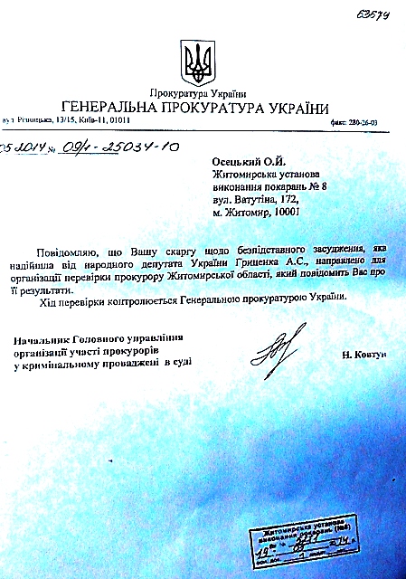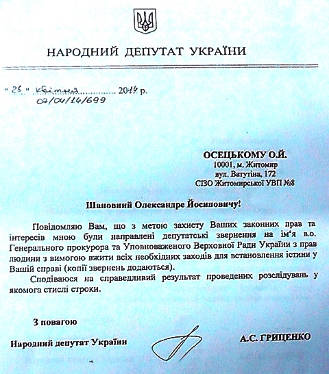 Не остались равнодушными к судьбе незаконно осуждённого Александра Осецкого народный депутат Украины А. Гриценко и Уполномоченная Верховной Рады по правам человека В. Лутковская, которые взяли под свой контроль ход рассмотрения этого дела.