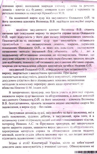 Весь этот беспредел не просто созерцали, но и преступно поддерживали районный прокурор Юрий Мельник, областные прокуроры Магалецкая, Кобернюк, Гнедой и прочие, высокооплачиваемые государством и не только им, чиновники. Во время апелляционных слушаний представитель областной прокуратуры госпожа Селюченко допускала высказывания, которые, на мой взгляд, несовместимы со статусом прокурора и пыталась оклеветать обвиняемого. По моему глубокому убеждению, основанному на изучении материалов уголовного дела и иных обстоятельств, перечисленные правоохренители наверняка знали о невиновности Александра Осецкого.