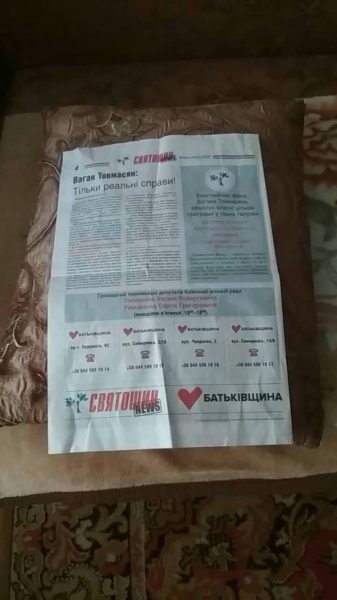 А также газетой «Святошин News» с заголовками вроде «Ваган Товмасян: Только реальные дела». В состав набора входили рис, мука, макароны, крупы, масло, сахар и чай.