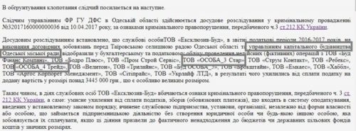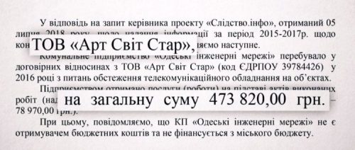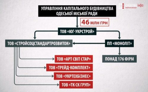 Журналисты проанализировали сотни официальных документов и выяснили интересную закономерность: фиктивные фирмы, на которые выводили деньги из «Виктории», обслуживали и другие проекты Одесской мэрии. С этими компаниями сотрудничали не только генеральный застройщик «Виктории», но и ряд других крупных подрядчиков горсовета. В частности, на компанию «Арт світ стар» перечисляли бюджетные средства за капитальный ремонт трех домов в центре города. И выводило деньги одно из коммунальных предприятий Одесской мэрии. По официальным документам, эта фиктивная компания, якобы, выполняла на объектах городского совета субподрядные работы.